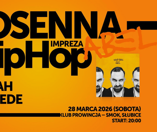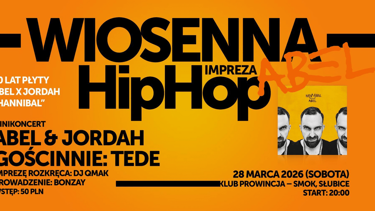 Wir laden Euch herzlich zur HipHop-Frühlingsparty ein, bei der wir uns an eines der wichtigsten Alben aus Słubice erinnern werden – das 10-jährige Jubiläum des Albums „Hannibal” von Abel x Jordah. An diesem Abend werden Abel und Jordah ein spezielles Minikonzert geben, bei dem Ihr Songs aus dem Album hören werdet, das für viele bereits ein Klassiker ist. Das Album „Hannibal” wurde auf Bühnen in ganz Polen gespielt – jetzt kehren wir in einer einzigartigen Atmosphäre gemeinsamer Party auf der Tanzfläche zu ihm zurück. Auf der Bühne wird auch ein besonderer Gast erscheinen – TEDE, und den ganzen Abend über wird DJ Qmak für Stimmung sorgen, der Hip-Hop-Klassiker und neue Stücke servieren wird – damit die Tanzfläche keinen Moment lang leer bleibt. Das Ganze wird von Bonzay moderiert.