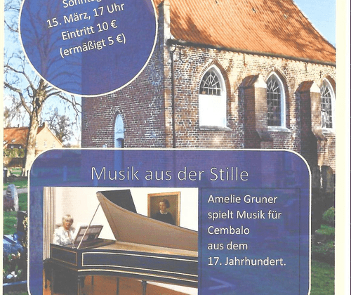 Passend zur "stillen" Passionszeit spielt Amelie Gruner besinnliche und nachdenkliche Werke aus dem 17. Jahrhundert:  Dietrich Buxtehude: Präludium, Fuge und Postludium g-moll Johann Jakob Froberger: Suite mit "Meditation sur ma mort future" Johann Kuhnau: Biblische Sonate Nr.6, "Jakobs Tod und Begräbnis" Louis Couperin: Tombeau für M. Blancrocher. In seinen "Biblischen Sonaten" versucht Johann Kuhnau, mit Tönen emotional gefärbte Bilder aus den biblischen Erzählungen entstehen zu lassen. Amelie Gruner hat beim Spielen von "Jakobs Tod und Begräbnis" gern dieses Bild von Rembrandt vor Augen ("Jakobssegen", 1656) Der sterbende Jakob, begleitet von seinem jüngsten Sohn Joseph und dessen Frau Asenat, segnet seine Enkel Ephraim un Manasse. Für mich atmet die von Amelie Gruner ausgewählte Musik den Geist der Stille. Etwa im "Tombeau" von Louis Couperin - einem musikalischen Nachruf auf den geschätzten Lautenisten Blancrocher - kann man spüren, wie die Musik auf der Grenze zur Stille verharrt, um sich dann wieder daraus zu lösen und schließlich zur Stille zurückzuführen. In der kleinen Kapelle Vreschen-Bokel mit ihrer intimen Atmosphäre entfaltet das Cembalo eine Klangfülle, die unter die Haut geht. Amelie Gruner lebt in Berlin und ist durch gute Beziehungen nach Apen auf die Kapelle aufmerksam geworden. Kontakt: Christian Andrae, Tel. 04489/404 98 44 Unterstützt vom Verein zur Förderung der Musik in der Kirche e.V.     http://www. zukunftmitmusik.de