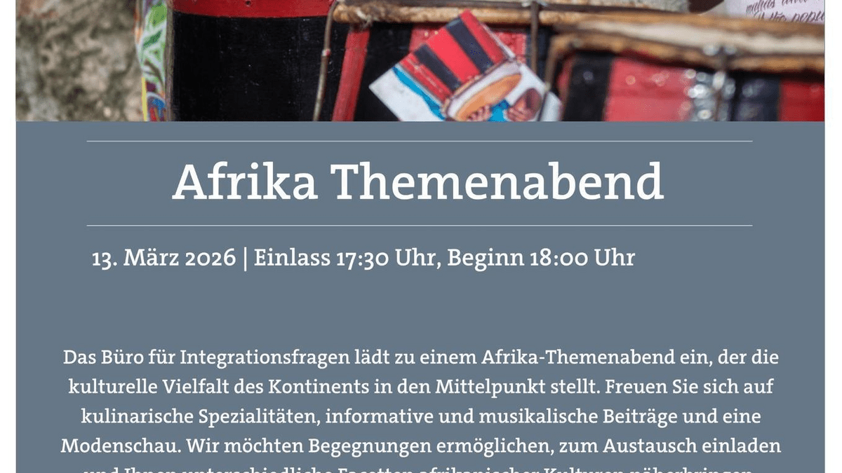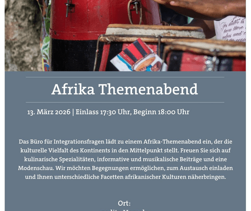 Das Büro für Integrationsfragen lädt zu einem Afrika-Themenabend ein, der die kulturelle Vielfalt des Kontinents in den Mittelpunkt stellt. Freuen Sie sich auf kulinarische Spezialitäten, informative Beiträge und eine Modenschau. Wir möchten Begegnungen ermöglichen, zum Austausch einladen und Ihnen unterschiedliche Facetten afrikanischer Kulturen näherbringen.