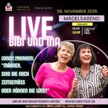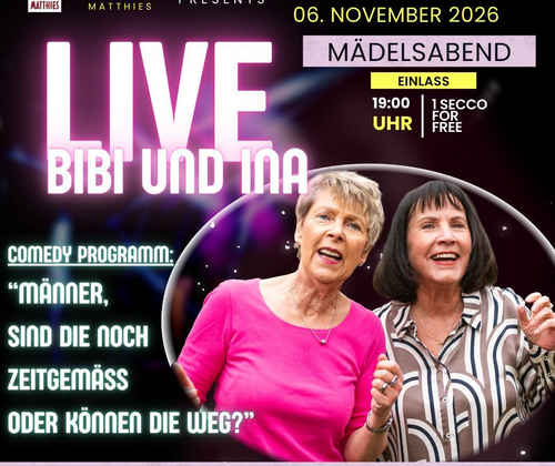 Schappe Dir deine beste Freundin, deine Schwester oder die ganze Mädels-Gang, denn am 06. November wird ab 19:30 Uhr auf dem Obsthof Matthies, die Bühne uns Frauen überlassen. Lasst uns ehrlich sein, die Männerwelt bietet genug Material für einen ganzen Abend voller Lacher. Die Power-Frauen Bibi & Ina nehmen die Spezies „Mann“ unter die Lupe und klären die brennende Frage: Sind Männer noch zeitgemäß? Oder können die weg? Mit Witz und Ironie gehen ‚Bibi & Ina‘ emanzipatorischen Fragen auf den Grund und kommen dabei zu überraschenden Einsichten. Erlebe einen Abend mit bissigem Witz, schonungsloser Ehrlichkeit und Lachkrämpfen garantiert! Wir freuen uns auf Dich und unseren gemeinsamen Mädelsabend!