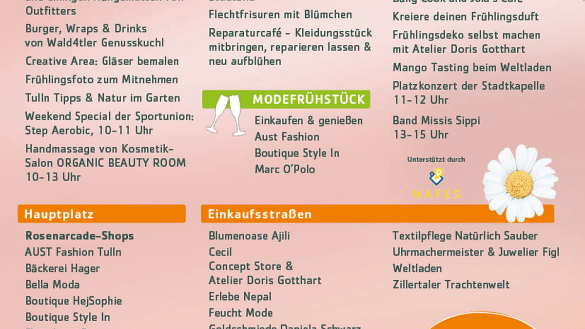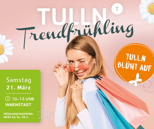 Von Montag, 23. bis Samstag, 28. März, könnt ihr in den teilnehmenden Betrieben der Tullner Innenstadt weiter frühlingshaft shoppen und euch persönlich beraten lassen.