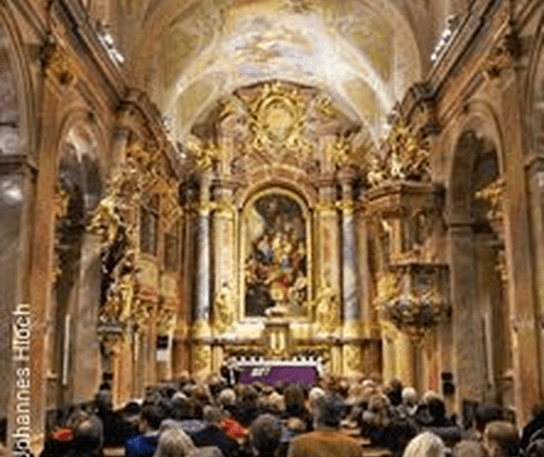 Die beheizte Kirche, die von Kaiserin Maria Theresia eingeweiht wurde, ist mit herrlichen Fresken von Daniel Gran, geschmückt, jenes Künstlers, der auch den Freskenzyklus in der Kuppel des Festsaales der Nationalbibliothek schuf.
