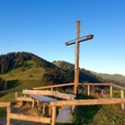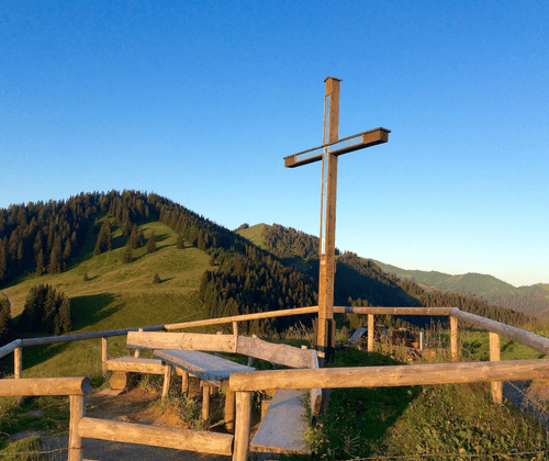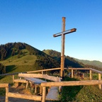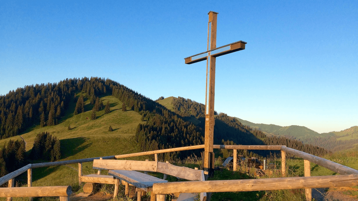 Auf dem Ofterschwanger Horn angekommen erwartet uns ein glühender Himmelsball mit einem strahlenden Leuchten, welches auf die noch friedlich schlafenden Orte unterhalb des Horns scheint. Dort oben stärken wir uns mit einer selbstmitgebrachten Brotzeit und genießen den traumhaften Ausblick ins Tal.