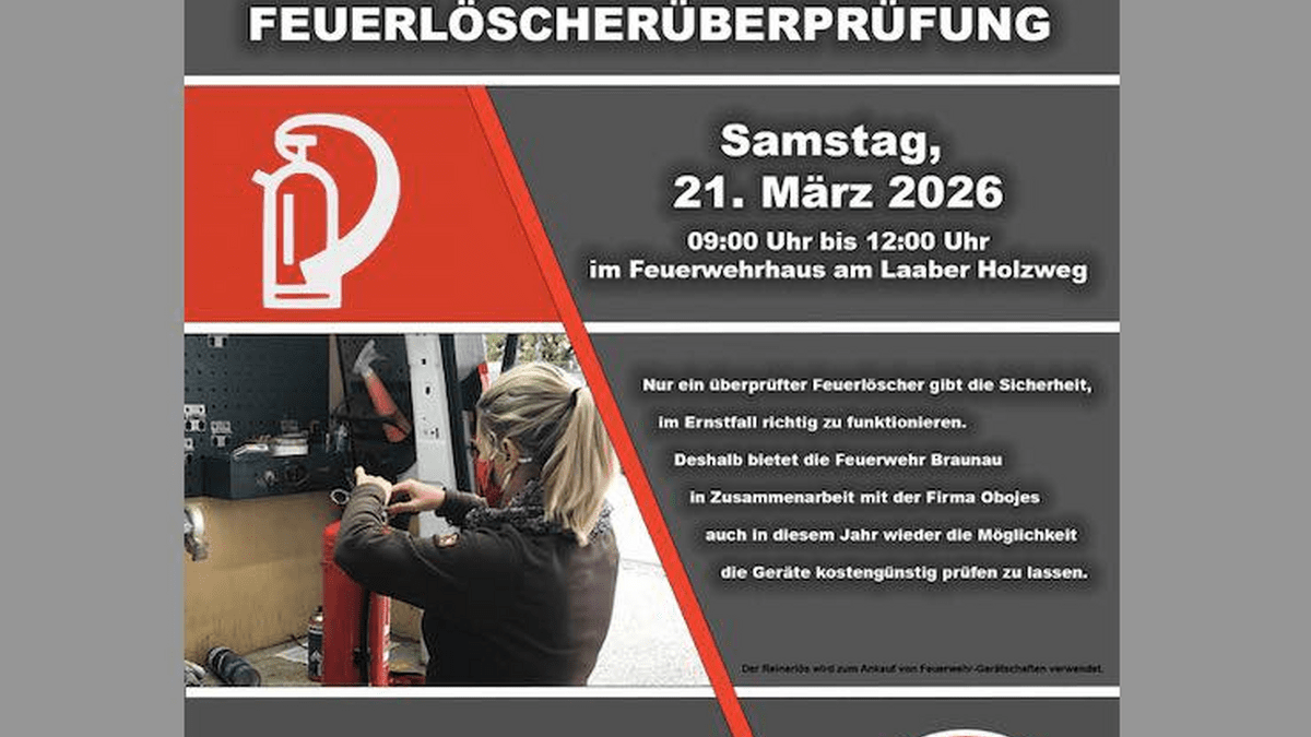 9:00 bis 12:00 UhrNur ein überprüfter Feuerlöscher gibt die Sicherheit, im Ernstfall richtig zu funktionieren. Deshalb bietet die Feuerwehr Braunau in Zusammenarbeit mit der Firma Obojes auch in diesem Jahr wieder die Möglichkeit, die Geräte kostengünstig prüfen zu lassen.Foto © Freiwillige Feuerwehr Braunau
