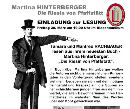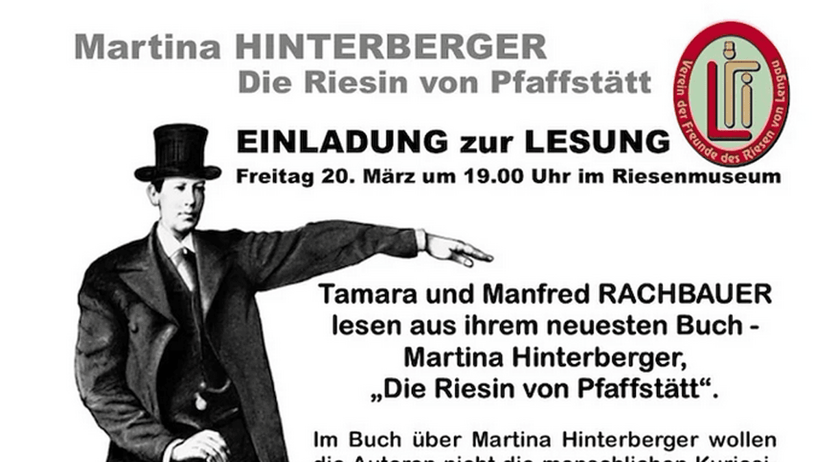 Kurios die Lebensgeschichte der „Riesin von Pfaffstätt, Martina Hinterberger“, aber sehr sehr traurig. Für eine Frau der damaligen Zeit war es ein besonders schlimmes Schicksal, das „Anders sein“ zu leben.Anhand zahlreicher Unterlagen ist es den beiden Historikern Tamara und Manfred Rachbauer gelungen, ausreichend Material über den Lebensweg der Riesin von Pfaffstätt zu sammeln und diesen sehr genau zu rekonstruieren. Nach fünf Jahren intensiver Riesinnenforschung haben diese umfangreichen Recherchen Eingang gefunden in das vorliegende Buch „Die Riesin von Pfaffstätt“.Tamara und Manfred Rachbauer, bekannte HeimatforscherInnen (und schon sehr häufig schriftstellerisch tätig mit Beiträgen im Bundwerk des IKK), die sich sehr intensiv und sehr häufig mit Geschichten aus dem Innviertel beschäftigen, präsentieren ihr Buch im Lengauer Riesenmuseum.Buchpräsentation, Lesung und Ausstellungseröffnung am Freitag, den 20. März 2026