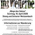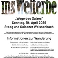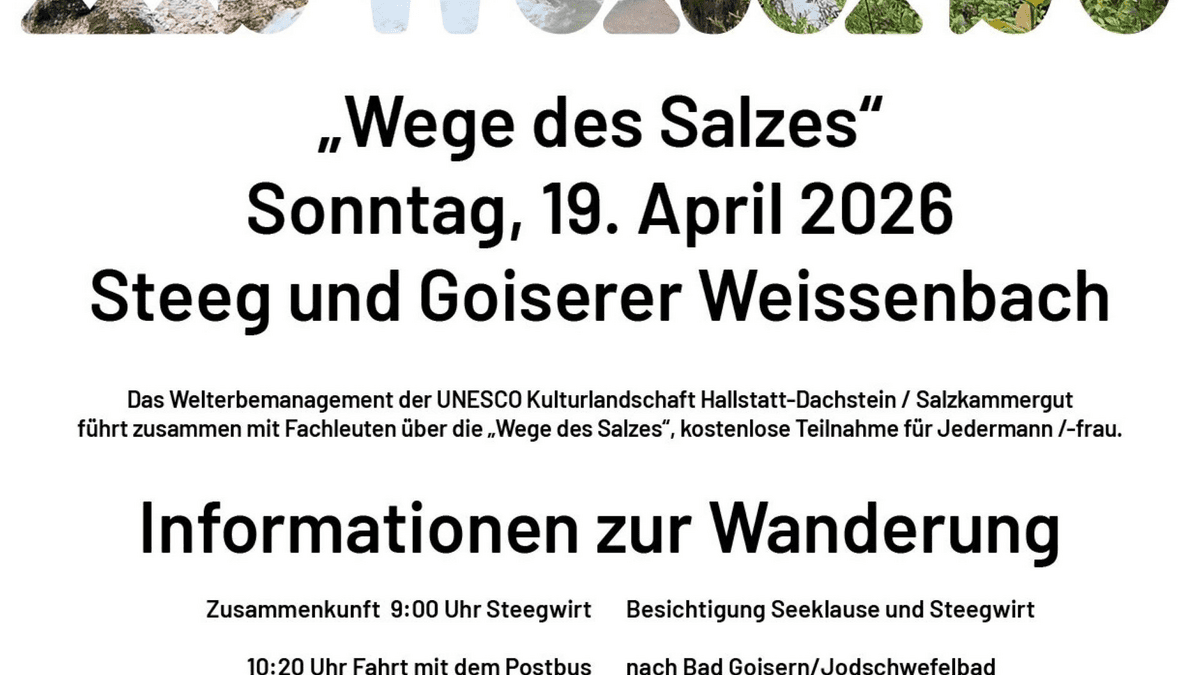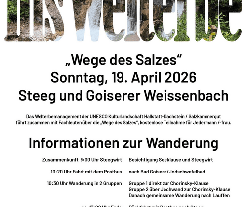 Geführte Wanderung entlang der historischen „Wege des Salzes“ im Inneren Salzkammergut. Im Rahmen des Welterbetags 2026 lädt das Welterbemanagement der UNESCO Kulturlandschaft Hallstatt-Dachstein/Salzkammergut zu einer besonderen Wanderung entlang der historischen „Wege des Salzes“ ein. Die geführte Tour führt durch eine Landschaft, die über Jahrhunderte vom Salzabbau und vom Transport des „weißen Goldes“ geprägt wurde.Startpunkt ist der Steegwirt in Steeg. Nach der Zusammenkunft am Morgen und einer kurzen Einführung führt das Programm zunächst zur Besichtigung der historischen Seeklause sowie des Steegwirts. Anschließend erfolgt die Fahrt mit dem Postbus nach Bad Goisern zum Jodschwefelbad, wo die eigentliche Wanderung beginnt.Die Teilnehmer/innen wandern in zwei Gruppen zur historischen Chorinsky-Klause. Eine Route führt direkt dorthin, während die zweite über den Jochwandweg verläuft. Beide Gruppen treffen sich anschließend wieder und setzen die gemeinsame Wanderung entlang der historischen Transportwege fort.Während der Tour vermitteln Fachleute spannende Einblicke in die Geschichte des Salz- und Holztransports im Salzkammergut. Diese Wege waren über Jahrhunderte entscheidend für die wirtschaftliche Entwicklung der Region und prägen bis heute die Kulturlandschaft des UNESCO-Welterbes Hallstatt-Dachstein/Salzkammergut.Die Teilnahme ist kostenlos. Führung, Busfahrt sowie eine Jause bei der Chorinsky-Klause werden vom Welterbemanagement übernommen.