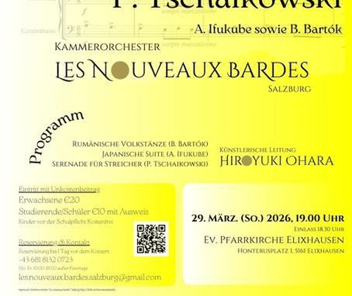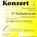 "Tanz und Serenade" Werke von P. Tschaikowsky Kammerorchester Les Nouveaux Bardes Salzburg Programm: Rumänische Volkstänze (B. Bartok) Japanische Suite (A.Ifukube) Serenade für Streicher (P. Tschaikowsky) Künstlerische Leitung: Hiroyuki Ohara Reservierung & Kontakt: Mo - Fr 10 - 18 Uhr außer Feiertage Tel. +43 681 813 207 23 Eintritt mit Unkostenbeitrag: Erwachsene Euro 20,-- Studierende/Schüler Euro 10,-- mit Ausweis Kinder vor der Schulpflicht kostenfrei Einlass 18:30 Uhr