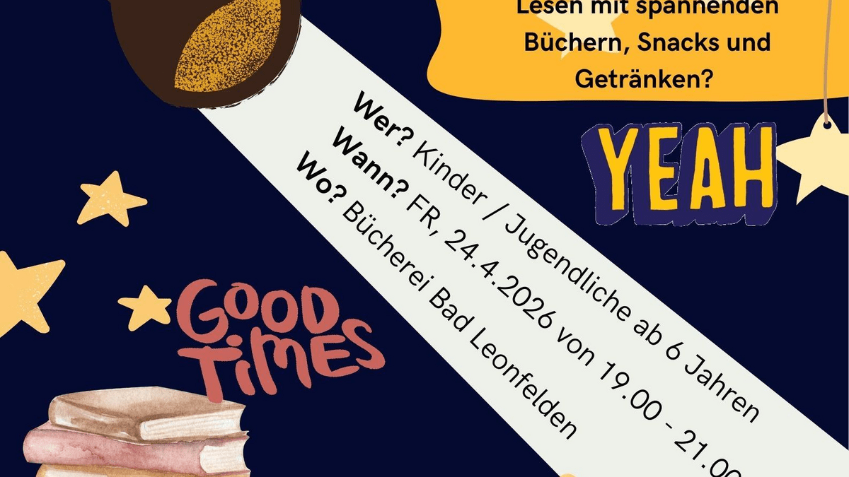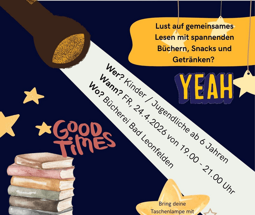 Im Rahmen der „LangenNacht der Bibliotheken“ am 24. April 2026 veranstaltet die Bibliothek Bad Leonfelden von 19.00 - 21.00 Uhr erneut ein Taschenlampenlesen 📖🔦.Bring deine Taschenlampe und gerne einen Polster und eine Decke mit.