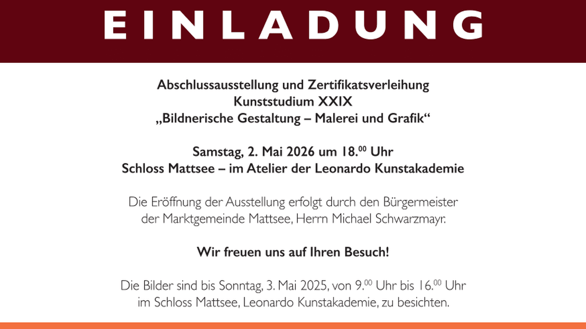 Schloss Mattsee – im Atelier der Leonardo Kunstakademie, am Samstag, den 2. Mai 2026 Die Eröffnung der Ausstellung erfolgt um 18:00 Uhr durch den Bürgermeister der Marktgemeinde Mattsee, Herrn Michael Schwarzmayr. Wir freuen uns auf Ihren Besuch! Die Bilder sind bis Sonntag, 3. Mai 2026, von 9.00 Uhr bis 16.00 Uhr