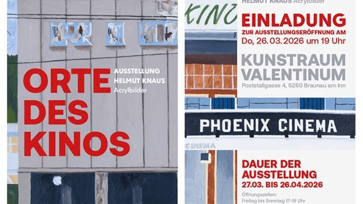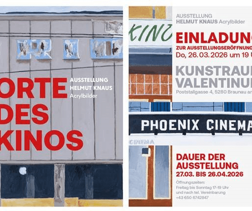 Vernissage: Donnerstag, 26. März 2026, 19:00 UhrEinladung zu einer besonderen Ausstellung:„ORTE DES KINOS“ von Helmut Knaus zeigt uns mehr als 50 Jahre Kino-Geschichte und Architektur.Der Künstler ist persönlich anwesend!Ausstellungsdauer: 27. März bis 26. April 2026Öffnungszeiten: Freitag bis Sonntag von 17:00–19:00 Uhr oder nach telefonischer Vereinbarung +43 650 6742847