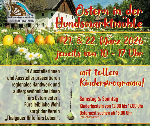 Ostern in der Hundsmarktmühle   Ein Ausflug für die ganze Familie. Kaffee & Kuchen Buffet, Kinderprogramm & viele Geschenkideen.  Am kommenden Samstag & Sonntag von 10-17 Uhr, direkt am schönen Fuschlsee-Rundwanderweg gelegen.  Schaut’s vorbei!