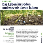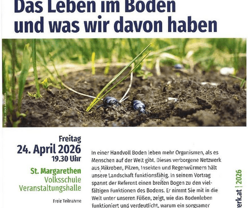 In einer Handvoll Boden leben mehr Organismen, als es Menschen auf der Welt gibt. Dieses verborgene Netzwerk aus Mikroben, Pilzen, Insekten und Regenwürmern hält unsere Landschaft funktionsfähig. In seinem Vortrag spannt der Referent Ass. Prof. Dr. Johann Zaller einen breiten Bogen zu den vielfältigen Funktionen des Bodens. Er nimmt Sie mit in die Welt unter unseren Füßen, zeigt, wie das Bodenleben funktioniert und verdeutlicht, warum ein sorgsamer Umgang mit der begrenzten Ressource Boden letztlich für uns alle von entscheidender Bedeutung ist. Bildungswerkleiter: Peter Löcker Vorsitzender: Bgm. Johann Lüftenegger