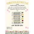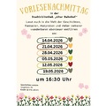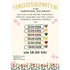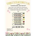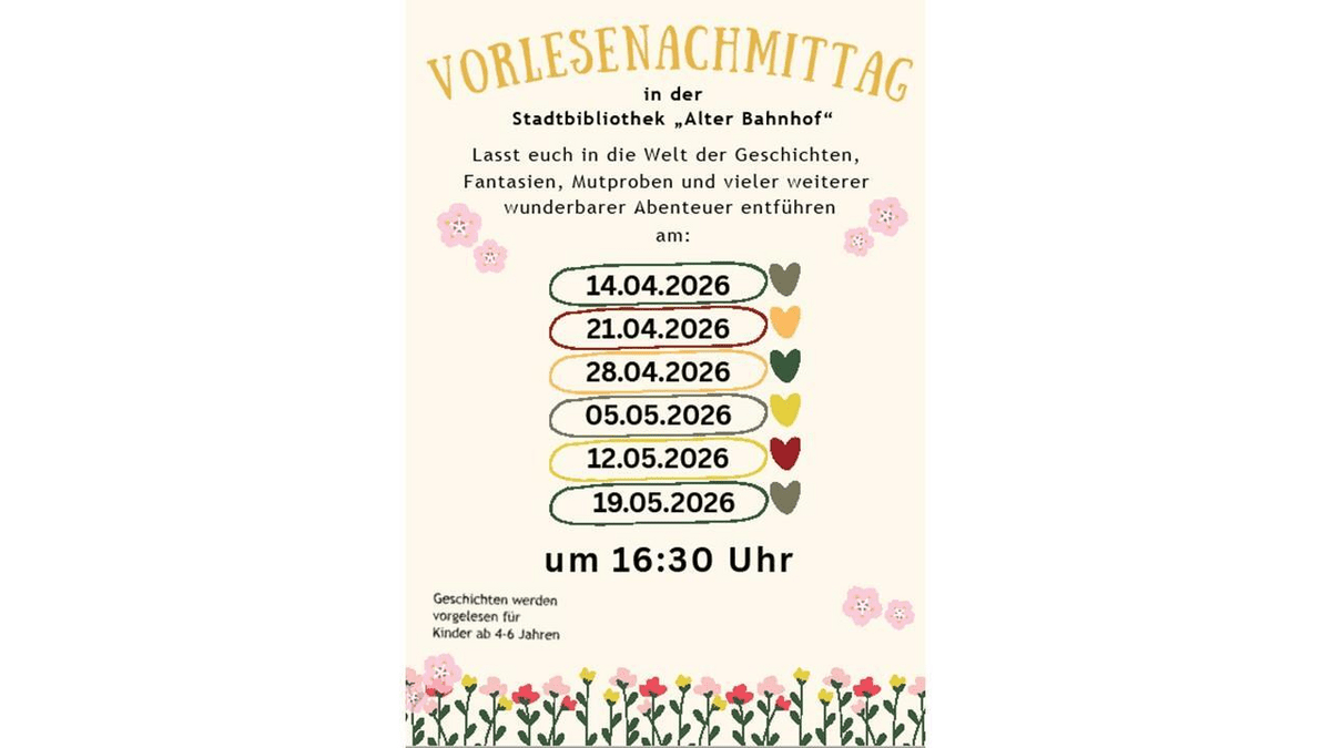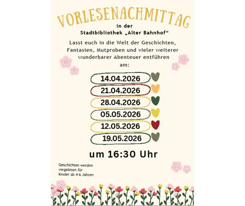 Vorlesenachmittag in der Stadtbibliothek "Alter Bahnhof" Lasst euch entführen ins Reich der Geschichten, Fantasien, Mutproben und vieler weiterer tollen Abenteuer. Geschichten werden vorgelesen für Kinder ab 4-6 Jahren. Los geht es jeden Dienstnachmittag um 16.30 Uhr (außer in den Ferien)