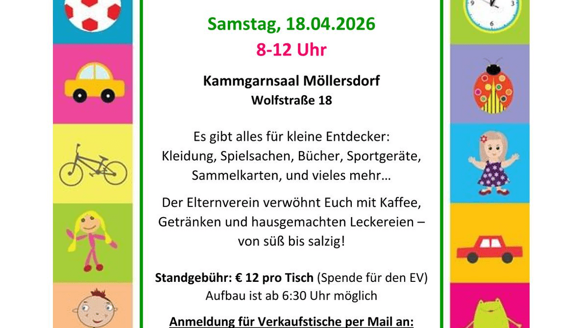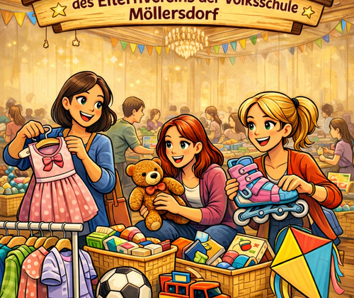 Der Elternverein der Volksschule Möllersdorf veranstaltet am 18.04.2026, von 8-12 Uhr wieder seinen beliebten KINDERSACHENFLOHMARKT.