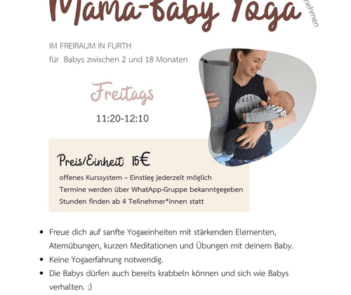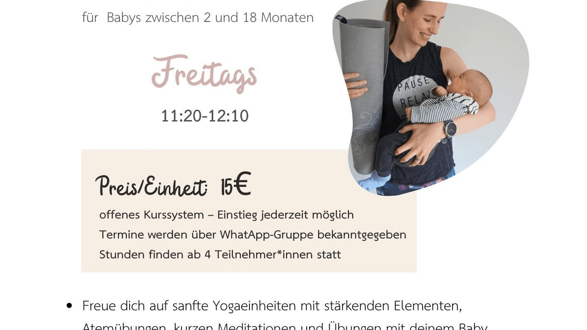 Freitag vormittags findet ein Mama-Baby Yogakurs mit mir im Freiraum in Furth im Bezirk Krems von 11:20 bis 12:10 statt. Du kannst dich flexibel zu den Stunden anmelden, die Einheiten finden ab vier Teilnehmern statt.