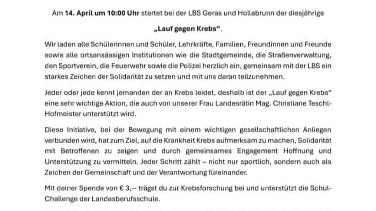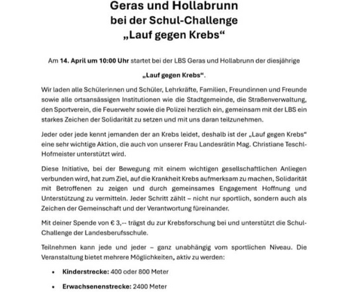 Unterstützen Sie die Landesberufsschule Geras und Hollabrunn bei der Schul-Challenge "Lauf gegen Krebs"