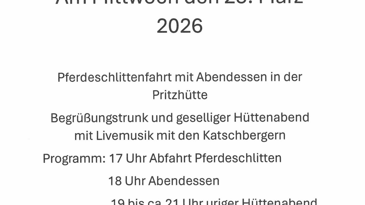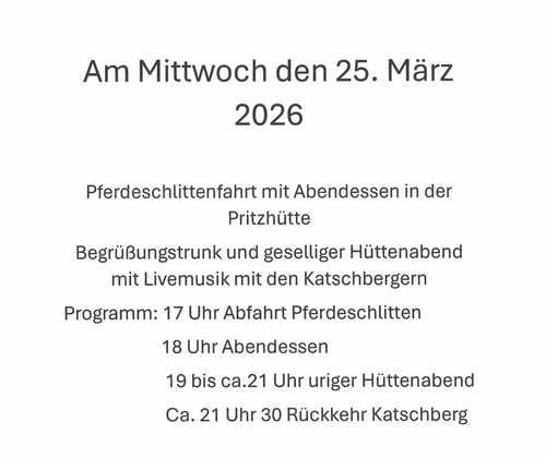 Pferdeschlittenfahrt mit Abendessen in der Pritzhütte Begrüßungstrunk und geselliger Hüttenabend mit Livemusik mit den Katschbergern Programm: 17 Uhr Abfahrt Pferdeschlitten 18 Uhr Abendessen 19 bis ca. 21 Uhr uriger Hüttenabend Ca. 21:30 Uhr Rückkehr Katschberg Sonderpreis Schlittenfahrt/Begrüßunggetränk und Abendessen €55,-- pro Person Anmeldung: 0664 / 2844583