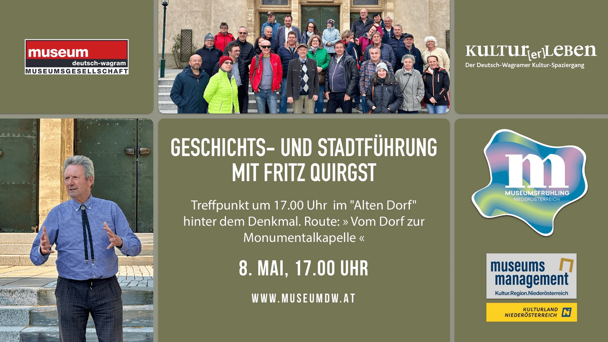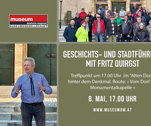 Im Rahmen des Museumsfrühlings Niederösterreich lädt die Museumsgesellschaft Deutsch-Wagram am Freitag, dem 8. Mai 2026, von 17 bis 19 Uhr zu einer Geschichts- und Stadtführung durch Deutsch-Wagram ein. Mit mehreren Programmpunkten beteiligt sich die Museumsgesellschaft an dieser landesweiten Initiative, die jeden Mai die Vielfalt der niederösterreichischen Museen, Sammlungen und Ausstellungshäuser sichtbar macht.