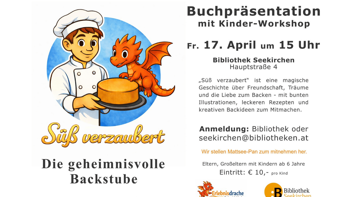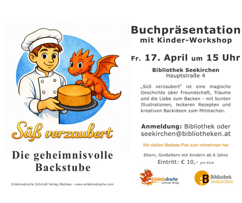 Die geheimnisvolle Backstube - Buchpräsentation und Workshop für Kinder "Süß verzaubert" ist eine magische Geschichte über Freundschaft, Träume und die Liebe zum Backen - mit bunten Illustrationen, leckeren Rezepten und kreativen Backideen zum Mitmachen. Anmeldung: in der Bibliothek oder per E-Mail seekirchen@bibliotheken.at Wir stellen Mattsee-Pan zum Mitnehmen her! Eltern, Großeltern mit Kindern ab 6 Jahren Eintritt: €10,- pro Kind Erlebnisdrache Schmidt Verlag Mattsee - www.erlebnisdrache.com