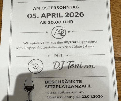 Am Ostersonntag lädt das Hotel Alte Post zu einem stimmungsvollen Oldie Abend ein. DJ Toni senior sorgt mit Hits aus den 60/70/80iger Jahren für beste musikalische Unterhaltung. Da die Sitzplatzanzahl begrenzt ist, wird um eine Reservierung bis 03. April 2026 gebeten. Tel.: +43 (0) 6414 / 207.