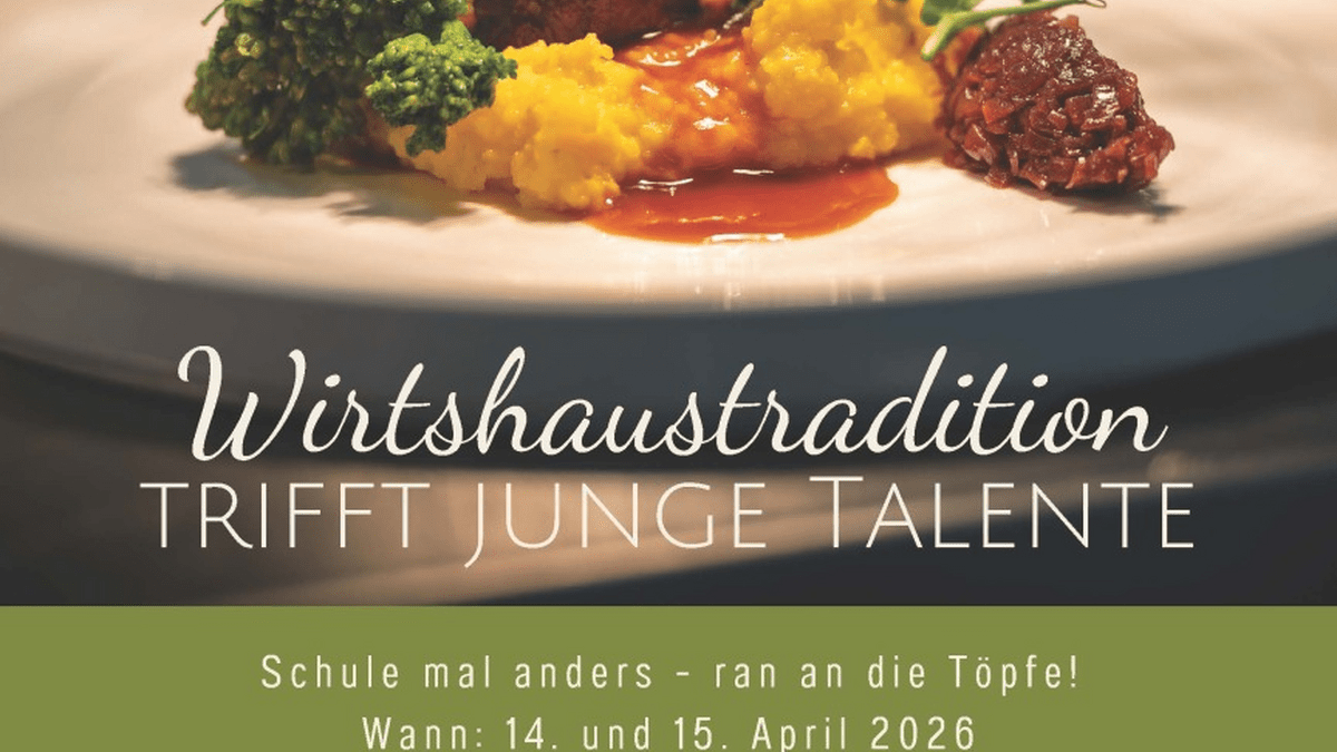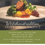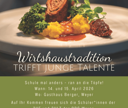 BBS Weyer | EventsDie BBS Weyer und die Schülerinnen und Schülern der 3HF und 3HLT laden herzlich zu einem ganz besonderen Abend einladen, denn am  14. und 15. April heißt es "Schule mal anders - ran an die Töpfe!", wenn Wirtshaustradition auf junge Gastrotalente trifft.Gemeinsam mit Kultiwirt-Ehepaar Kristina und Helmut Berger vom Gasthaus Berger in Weyer verwöhnen die angehenden Gastgeberinnen und Küchenchefs ihre Gäste mit klassischer Wirtshausküche und feinen Getränken.Ort: Gasthaus Berger WeyerDatum: 14. und 15. April 2026Zeit: 17 - 22 UhrKostenpunkt: 5-Gänge-Menü inkl. Aperitif, ohne Getränke - € 55 pro PersonDie Schülerinnen und Schüler der 3HF und 3HLT freuen sich, an diesem Abend viele Gäste begrüßen zu dürfen!
