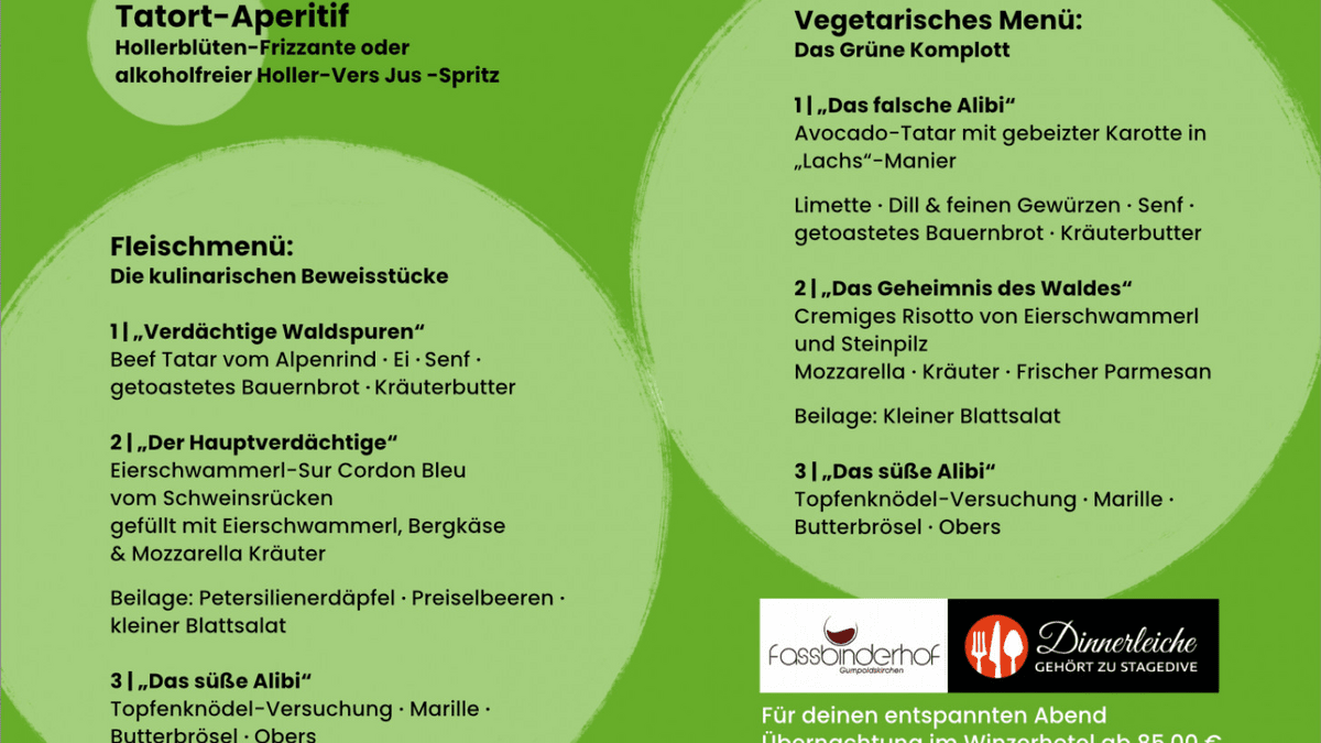 Krimidinner im Heurigen Fassbinderhof am 5. Juni 2026 und 19:00 Uhr.