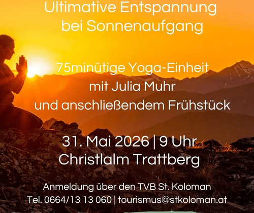 Preis: EUR 49,00 Yoga plus Frühstück (Maut ist extra zu zahlen)Anmeldung über den TVB St. Koloman: Tel 0664 13 13 060 email: tourismus@stkoloman.at