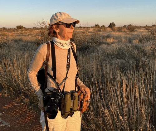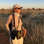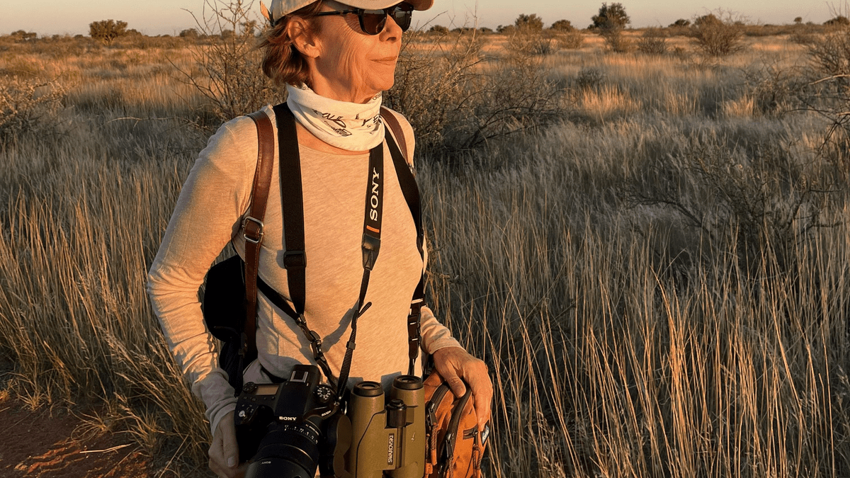 mit einem riesigen Geländeauto durch Wüste und Savanne unterwegs und beweist mit