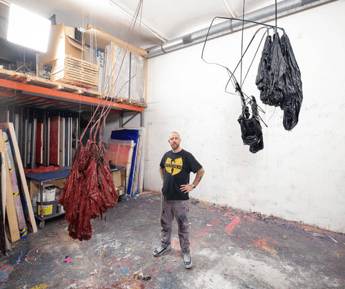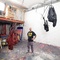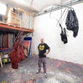 Im ersten Raum hängen Parachute Sculptures von der Decke oder stehen im Raum wie eingefrorene Körper — Fallschirme, deren Fall gestoppt wurde. Ihre Falten sind mit Epoxidharz fixiert, als hätten sie den Moment festgehalten, der sich eigentlich nicht festhalten lässt. Die Parachute Paintings an den Wänden brechen die Grenzen von Malerei und Skulptur auf. Was als leichte Textur erscheint, entpuppt sich als harte, geformte Materie — eine Wahrnehmungstäuschung, die erst im Nahkontakt deutlich wird.
