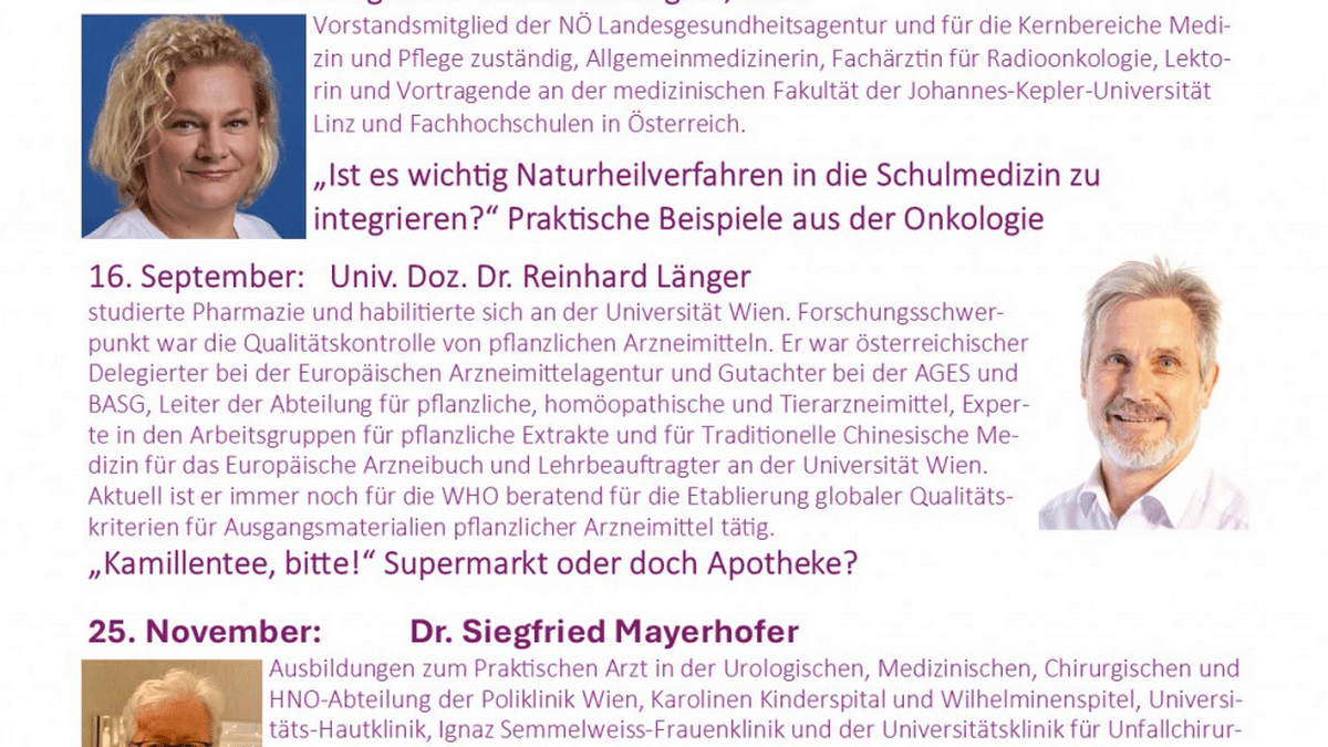 Wir beginnen diesen Vortragsabend mit einer feierlichen Vesper, welche uns den Stress und die Anspannung des Tages nimmt und somit Platz in unserem Geist wird für einen spannenden Vortrag: Frau Mag. Dr. Elisabeth Bräutigam ist MBA Vorstandsmitglied der NÖ Landesgesundheitsagentur und für die Kernbereiche Medizin und Pflege zuständig. Als Allgemeinmedizinerin, Fachärztin für Radioonkologie, Lektorin und Vortragende an der medizinischen Fakultät der Johannes-Kepler-Universität Linz und Fachhochschulen in Österreich, wird sie uns an diesem Abend zum Thema „Ist es wichtig Naturheilverfahren in die Schulmedizin zu integrieren?“ Praktische Beispiele aus der Onkologie vortragen. Bei einer abschließenden Agape ist Zeit um mit der Medizinerin und den anwesenden TeilnehmerInnen noch zu plaudern und zu diskutieren.