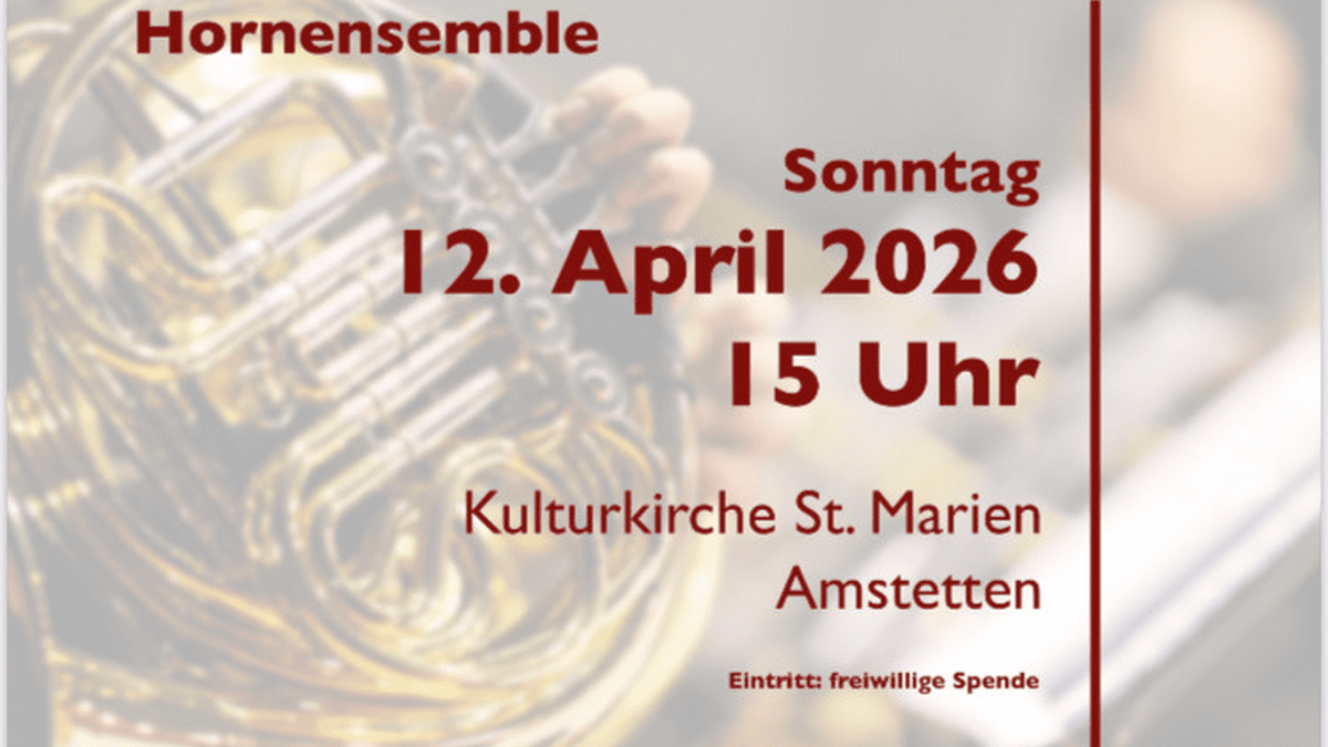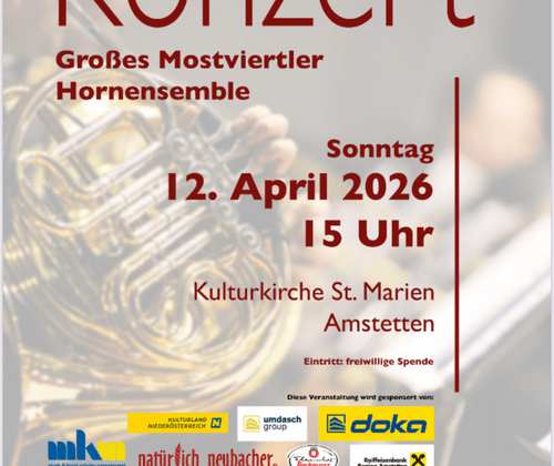 Das Mostviertler Hornensemble ist als Gemeinschaftsprojekt der umliegenden Musikschulen mittlerweile zum Fixpunkt für Hornbegeisterte aller Altersstufen geworden. Am frühen Nachmittag des 12. April 2026 wird dem Horn ein Konzert mit einem überaus bunten Programm gewidmet, welches die Vielfalt und Klangschönheit des Instruments in den Mittelpunkt stellt.