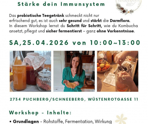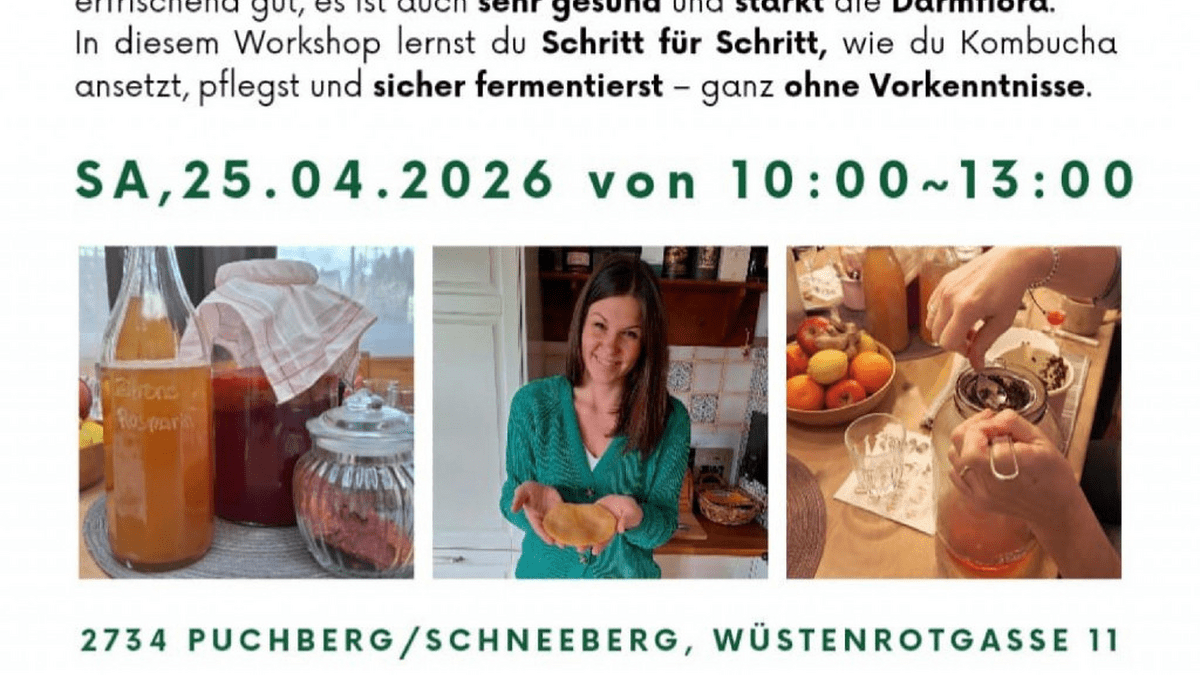 Das probiotische Teegetränk schmeckt nicht nur erfrischend gut, es ist auch sehr gesund und stärkt die Darmflora. In diesem Workshop lernst du Schritt für Schritt, wie du Kombucha ansetzt, pflegst und sicher fermentierst - ganz ohne Vorkenntnisse.