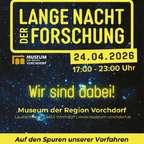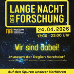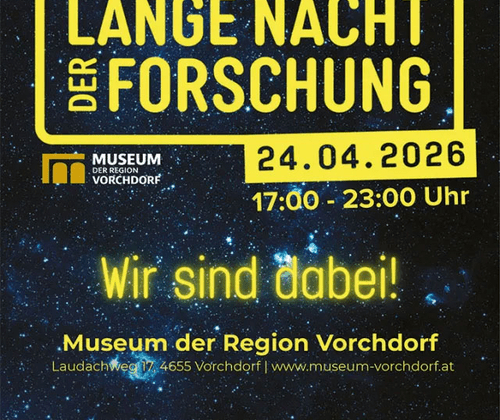 Unter dem Motto „Spurensuche: Wo komm ich her & was erlebten meine Vorfahren?“ lädt das Museum der Region Vorchdorf & der Heimatverein Vorchdorf zur Langen Nacht der Forschung ein. Die Besucher erwartet ein abwechslungsreicher Abend rund um Familiengeschichte, historische Forschung und das Entdecken der eigenen Wurzeln – spannend, interaktiv und für alle Altersgruppen geeignet.Auf folgende spannende Programmpunkte dürft ihr euch freuen:Einblicke in echte Familien- und AhnenforschungEigene Wurzeln erforschen mit digitalen und historischen QuellenAlte Schriften lesen und entschlüsseln – spielerisch und kreativWie Geschichte erforscht wird: Objekte, Quellen & moderne HilfsmittelAustausch mit Mitgliedern des HeimatvereinsAbschlussquizEin Abend zum Staunen, Mitmachen und Selberforschen.