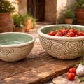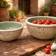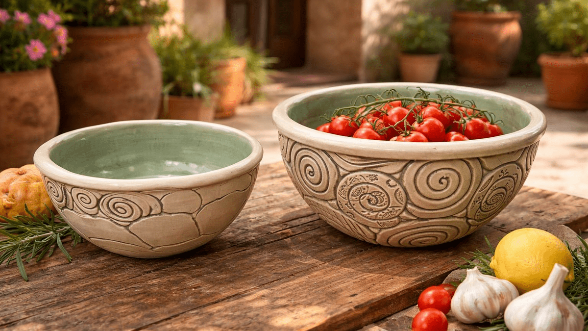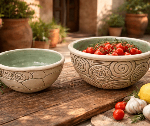 Wir gestalten, probieren Muster, arbeiten mit Stempeln und farbigem Tonschlicker (Engobe). Nach dem Schrühbrand bekommen die Stücke im Glasurbrand bei 1220 Grad ihr Finish - spülmaschinentauglich und frostsicher. Zwischendurch gibt's eine entspannte Mittagspause zum Durchatmen und Austauschen.