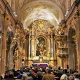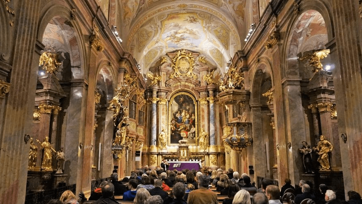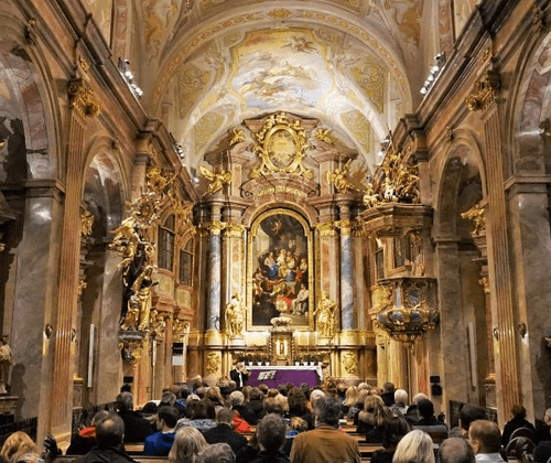 Die beheizte Kirche, die von Kaiserin Maria Theresia eingeweiht wurde, ist mit herrlichen Fresken von Daniel Gran, geschmückt, jenes Künstlers, der auch den Freskenzyklus in der Kuppel des Festsaales der Nationalbibliothek schuf.