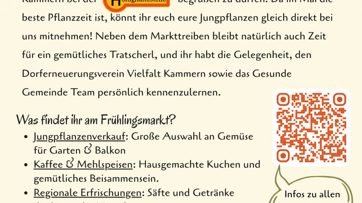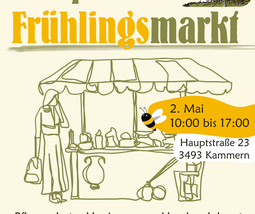 Es freut uns sehr, den Mai mit einem kleinen Frühlingsmarkt bei uns beim Hofladen in Kammern zu starten. Neben dem Markttreiben bleibt natürlich auch Zeit für ein gemütliches Tratscherl, und ihr habt die Gelegenheit, den Dorferneuerungsverein Vielfalt Kammern sowie das Gesunde Gemeinde Team persönlich kennenzulernen.