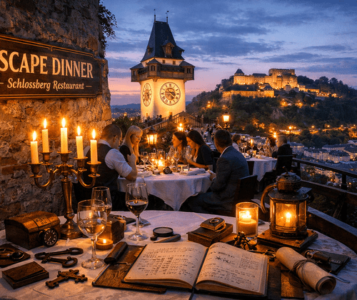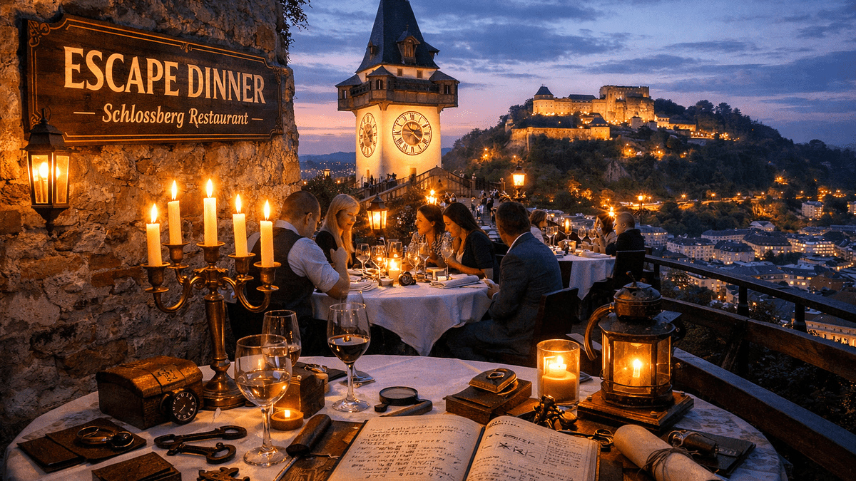 Escape Dinner im Restaurant Schlossberg in Graz verbindet feine Kulinarik mit klugem Rätselspaß hoch über den Dächern der Stadt. Am 7. November verwandelt sich das stilvolle Haus am Schlossberg in eine Bühne für Genuss, Teamgeist und kleine Überraschungen. Serviert wird ein köstliches 3-Gänge-Menü, begleitet von Hinweisen, Codes und Aufgaben, die zwischen den Gängen für Spannung sorgen. So entsteht ein Abend, der ruhig beginnt und mit jedem Gang mehr Fahrt aufnimmt. Das Restaurant Schlossberg zählt zu den bekannten Genussadressen in Graz und passt mit seiner Lage, dem Blick über die Stadt und dem eleganten Ambiente ideal zu diesem Format. Gerade diese Mischung macht den Reiz aus: gutes Essen, gemeinsames Kombinieren und ein Setting, das den Schlossberg von seiner genussvollen Seite zeigt. Für Gäste aus Graz, aus der Steiermark und für Ausflüge in die Erlebnisregion Graz ist das Escape Dinner eine stimmige Idee für einen besonderen Abend mit Freunden, Familie oder Kollegen. Wer Kulinarik nicht nur kosten, sondern auch spielerisch erleben will, findet hier genau das richtige Tempo: aufmerksam genießen, Hinweise entdecken, zusammen lösen und dabei den Abend Schritt für Schritt weiterdrehen. Ein Genussformat mit Charme, Aussicht und einer guten Portion Spannung in der Steiermark.