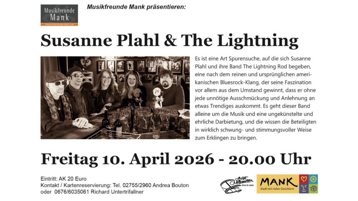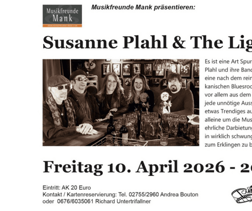 Organisiert von den Musikfreunden Mank werden am 10. April 26 um 20.00 Uhr Susanne Plahal und ihre Musiker die Bühne im Kino Achtmillimeter in Mank betreten.