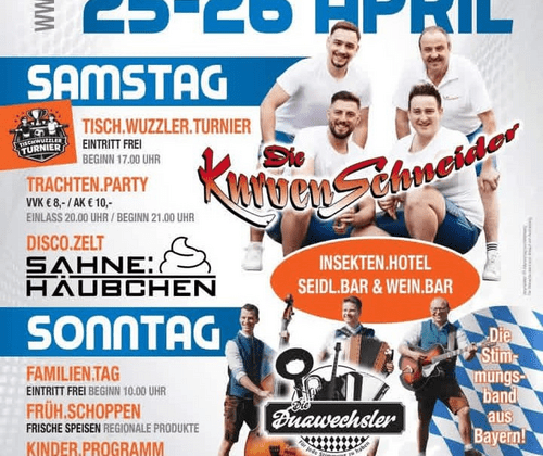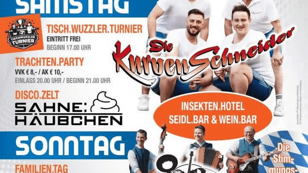 Im Anschluss starten „DIE KURVENSCHNEIDER“, die das Festzelt in eine tolle Stimmungslocation verwandeln werden. Im Discozelt geht's ab 22 Uhr mit dem DJ Duo SAHNE:HÄUBCHEN rund.