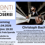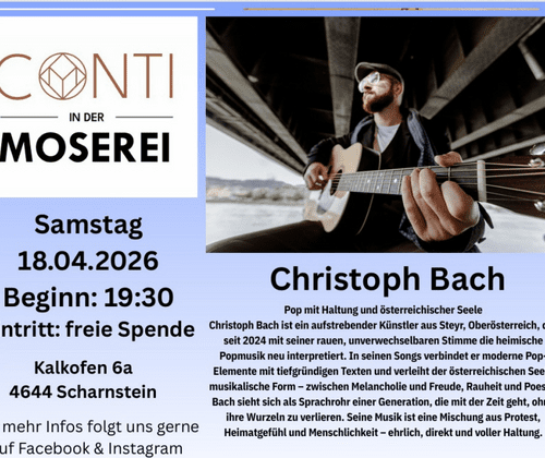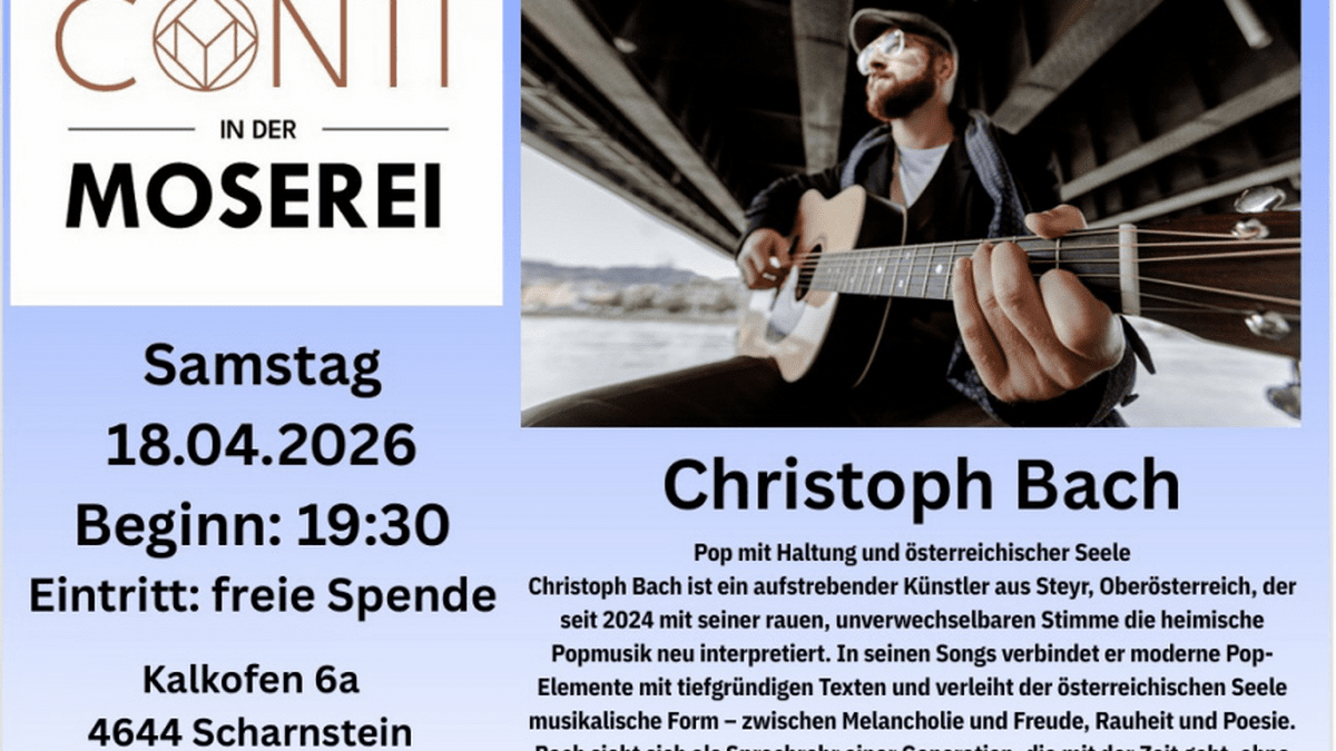 Christoph Bach ist ein aufstrebender Künster aus Steyr, der seit 2024 mit seiner rauen, unverwechselbaren Stimme die heimische Popmusik neu interpretiert. In seinen Songs verbindet er moderne Pop-Elemente mit tiefgrünidgen Texten und verleiht der österreichischen Seele musikalische Form - zwischen Melancholie und Freude, Rauhheit und Poesie. Bach sieht sich als Sprachrohr einer Generation, die mit der Zeit geht, ohne ihre Wurzeln zu verlieren. Seine Musik ist eine Mischung aus Protest, Heimatgefühl udn Menschlichkeit - ehrlich, direkt und voller Haltung.
