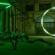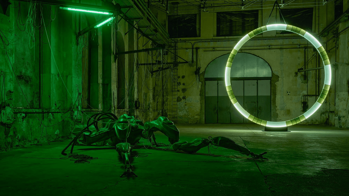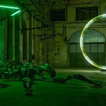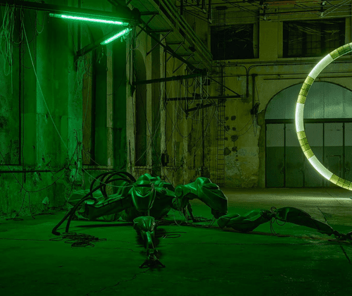 Mit 47°24’35’’ N / 9°44’20’’ E realisiert Davide Allieri (* 1982, Bergamo, Italien) im Kunstraum Dornbirn sein bislang größtes Environment. Er schirmt die historische Industriehalle vollständig vom Tageslicht ab und transformiert sie mit einer künstlichen Licht- und Klangatmosphäre in eine begehbare Science-Fiction-Landschaft. Monumentale Skulpturen aus Fiberglas – ein leuchtendes Portal und ein roboterhafter Maschinenkörper – stehen in einem Geflecht aus Kabeln, Licht und eigens komponiertem Sound von Francesco Peccolo. Besuchende betreten eine fremdartige Welt, in der Technik wie das Überbleibsel einer möglichen Zukunft wirkt und menschliche Präsenz nur noch als Spur wahrnehmbar ist.