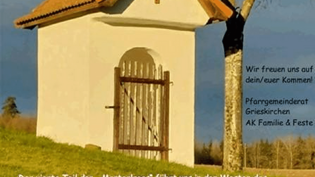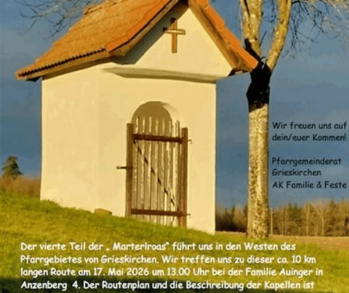 Der vierte Teil der "Marterlroas" führt uns in den Westen des Pfarrgebietes von Grieskirchen. Wir treffen uns zu dieser ca. 10 km langen Route am 17. Mai 2026 um 13.00 Uhr bei der Familie Auinger in Anzenberg 4. Der Routenplan und die Beschreibung der Kapellen ist auf www.pfarre.grieskirchen@dioezese-linz.at ersichtlich.