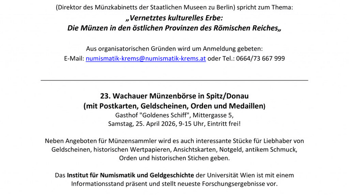 Das Institut für Numismatik und Geldgeschichte der Universität Wien ist mit einem Informationsstand präsent und stellt neueste Forschungsergebnisse vor.