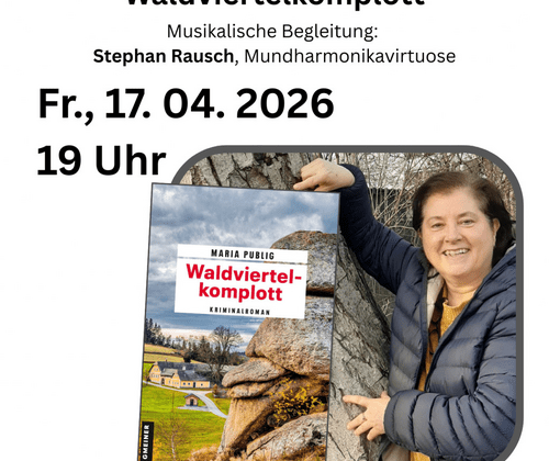 Wir freuen uns sehr, dass wir die erste Bücherei im Wald4tl sind, in der Maria Publig ihren neuesten Krimi "Waldviertelkomplott" präsentieren wird. Die Autorin liest mit Musikalischer Begleitung des Munharmonikavirtuosen Stephan Rausch. Lassen Sie sich das nicht entgehen! Es wird ein unterhaltsamer Abend!