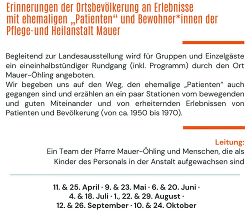 Begleitend zur Landesausstellung wird für Gruppen und Einzelgäste ein eineinhalbstündiger Rundgang (inkl. Programm) durch den Ort Mauer-Öhling angeboten.