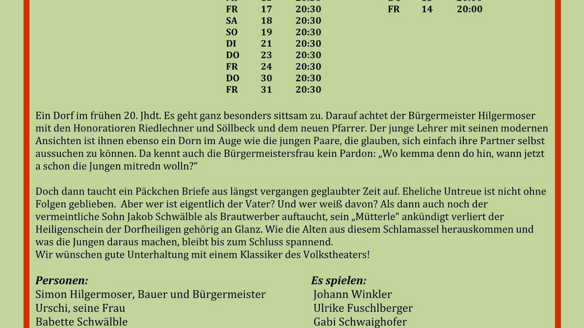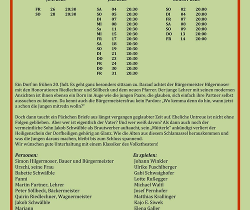 Das Theater Abtenau veranstaltet ein Freilicht-Theater im Heimatmuseum Arlerhof und präsentiert einen Klassiker des Volkstheaters: DIE DREI DORFHEILIGEN, ein Bauernschwank von Max Neal und Max Ferner Bearbeitung und Regie: Veronika Pernthaner-Maeke Ein Dorf im frühen 20. Jhdt. Es geht ganz besonders sittsam zu. Darauf achtet der Bürgermeister Hilgermoser mit den Honoratioren Riedlechner und Söllbeck und dem neuen Pfarrer. Der junge Lehrer mit seinen modernen Ansichten ist ihnen ebenso ein Dorn im Auge wie die jungen Paare, die glauben, sich einfach ihre Partner selbst aussuchen zu können. Da kennt auch die Bürgermeistersfrau kein Pardon: „Wo kemma denn do hin, wann jetzt a schon die Jungen mitredn wolln?“