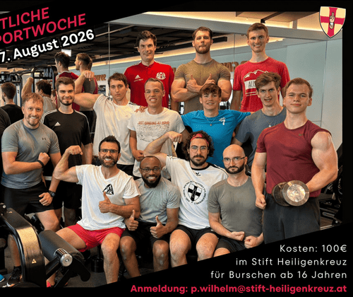 Was ist eine „Geistliche Sportwoche“? Eine Woche intensives Kraftsporttraining unter fachlicher Anleitung mit geistlichen Vorträgen für Burschen ab 16 Jahren.