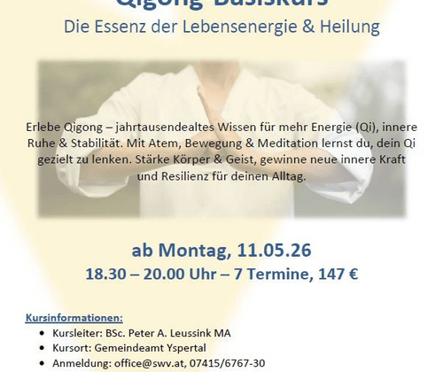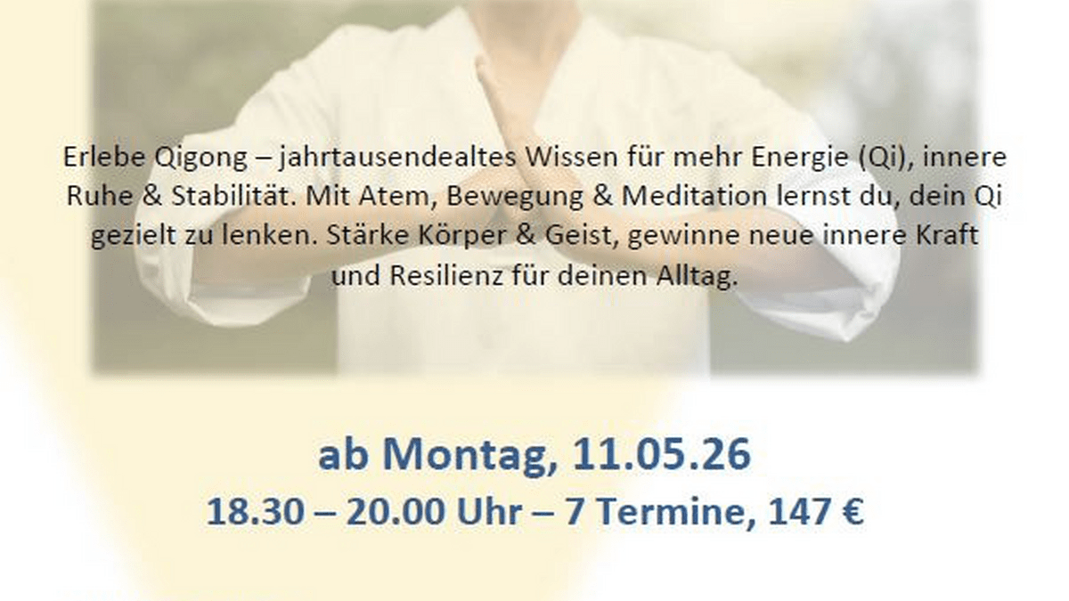 Erlebe Qigong – jahrtausendealtes Wissen für mehr Energie (Qi), innere Ruhe & Stabilität. Mit Atem, Bewegung & Meditation lernst du, dein Qi gezielt zu lenken. Stärke Körper & Geist, gewinne neue innere Kraft und Resilienz für deinen Alltag.