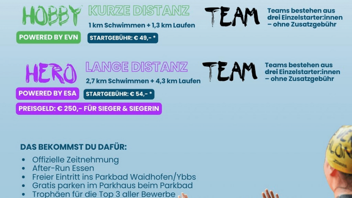 Der Riverthlon ist ein Kombinations-Ausdauerrennen für Hobby-, Profis und Teams im wunderschönen Waidhofen an der Ybbs. Es wird abwechselnd gelaufen und geschwommen ohne Wechselzonen. Schwimmen in der Ybbs und entlang der Ybbs laufen ist ein einzigartiges Erlebnis, Bei gutem Wetter ist die Ybbs glasklar.