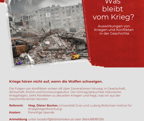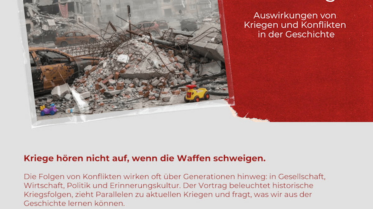 Die Folgen von Konflikten wirken oft über Generationen hinweg: in Gesellschaft, Wirtschaft, Politik und Erinnerungskultur. Der Vortrag beleuchtet historische Kriegsfolgen, zieht Parallelen zu aktuellen Kriegen und fragt, was wir aus der Geschichte lernen können.